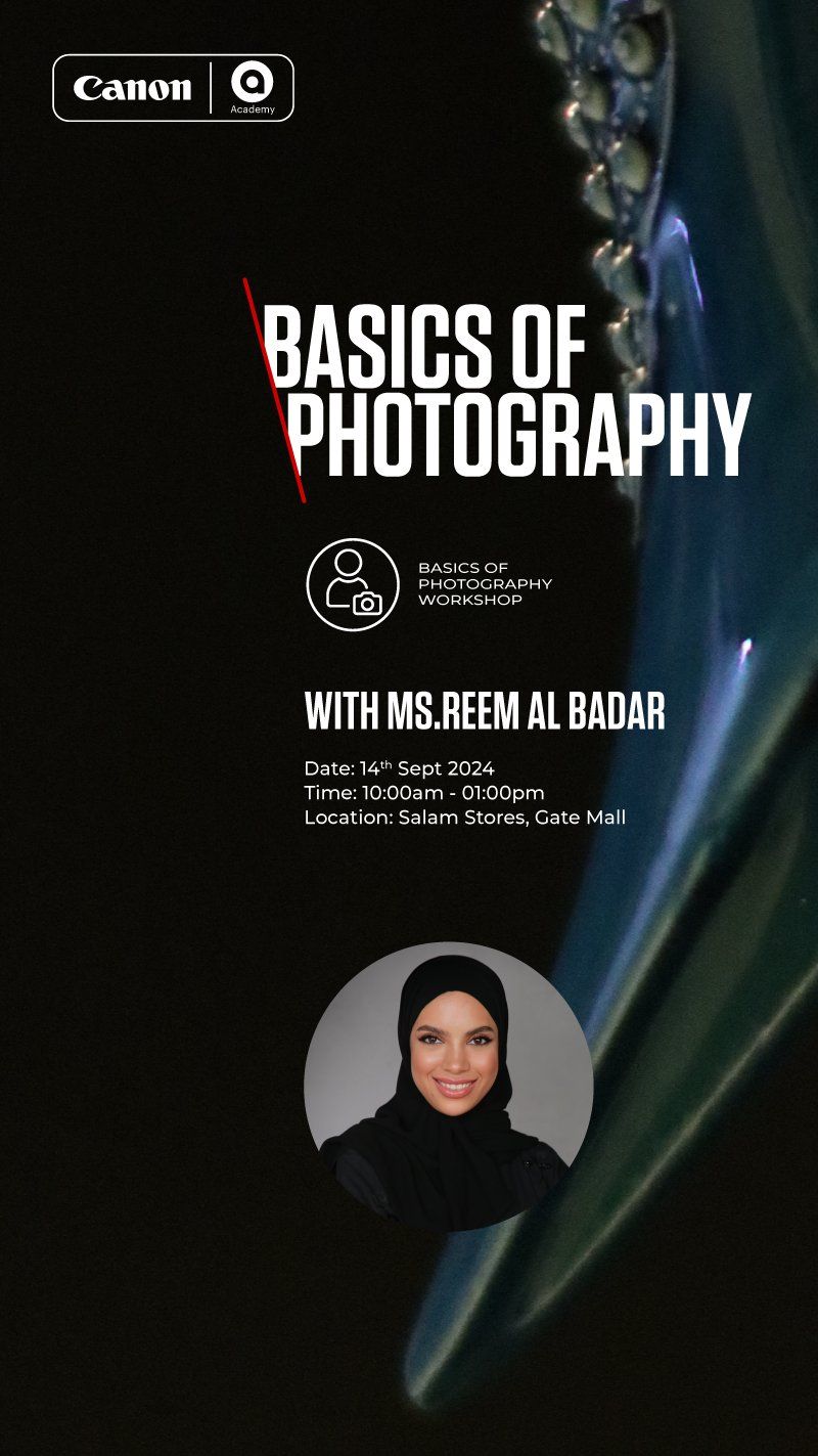 Basics of photography Ms.Reem Al Badar, 14th September 2024 Salam Stores, Gate Mall 10:00 AM – 1:00 PM