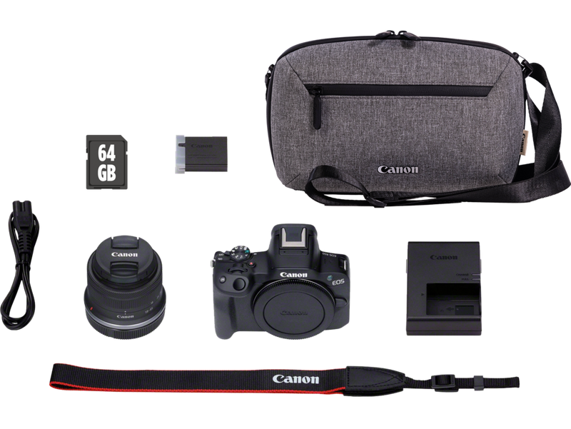Canon EOS R50 Mirrorless Camera, Black + RF-S 18-45mm F4.5-6.3 IS STM Lens + Backpack + SD Card